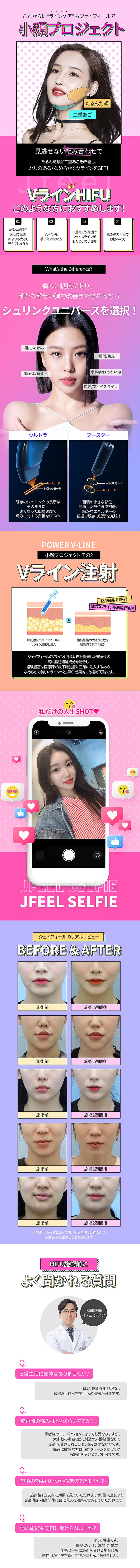 たるみや脂肪のお悩みを改善してすっきりフェイスラインに ジェイフィールの小顔Vラインプロジェクト 高周波や超音波などさまざまな機器をご用意 個人の肌タイプやお悩みに合ったリフトアップ施術が可能 肌質や骨格などを把握して分析したのち 部位別にショット数や強度をデザイン