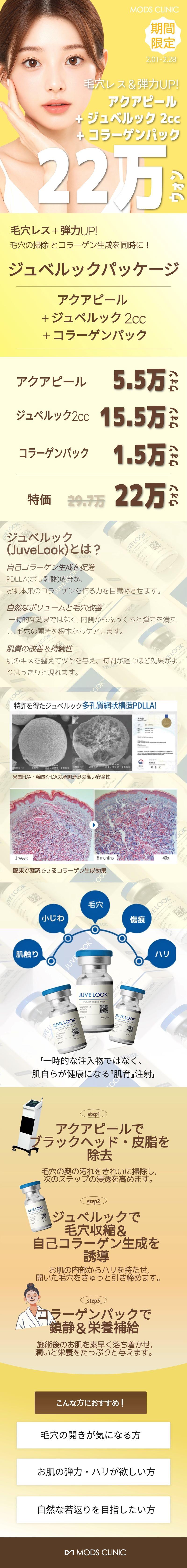 2月限定(2.01~2.28)日本のお客様向け特別体験イベント ※ 1様1回検定 ※ 本イベントは、期間内にご来院およびご予約を完了された方が対象となります。 (2月28日までに予約完了された方にイベント価格適用) アクアピール:55,000ウォン ジュベルック(2cc):150,000ウォン コラーゲンパック:15,000ウォン