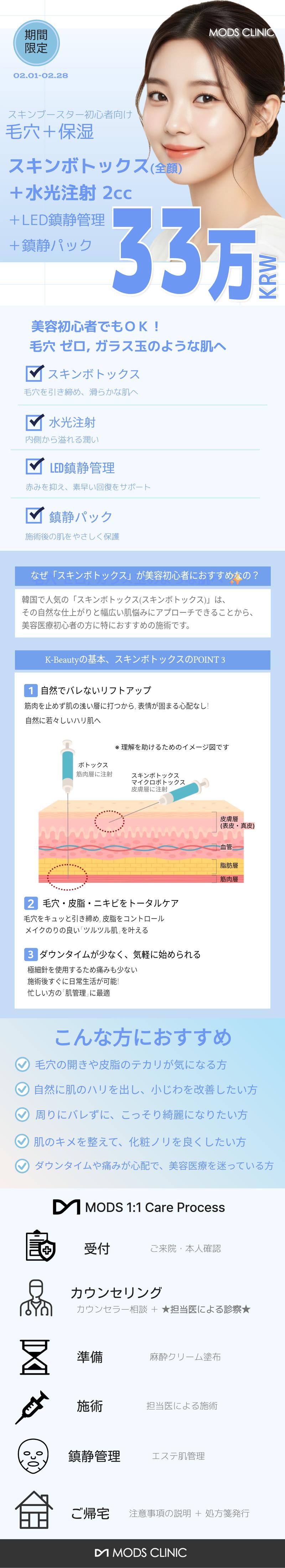 2月限定(2.01~2.28)日本のお客様向け特別体験イベント ※ 1様1回検定 ※ 本イベントは、期間内にご来院およびご予約を完了された方が対象となります。 (2月28日までに予約完了された方にイベント価格適用) スキンボトックス (全顔):220,000ウォン 水光注射 (2cc):80,000ウォン LED再生レーザー管理:20,000ウォン 鎮静マスクパック:10,000ウォン