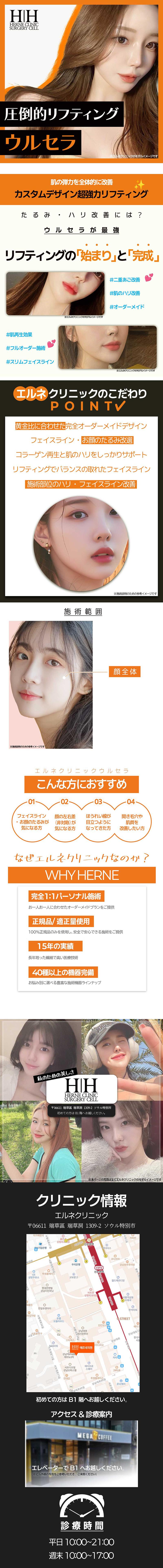 ウルセラは、HIFU(高密度焦点式超音波)を使用し、皮膚の奥深くの筋膜層(SMAS層)に熱エネルギーを届けることで、コラーゲン生成を促し、たるみやゆるみを根本から引き締めるリフティング施術です。 期待できる効果 - たるみ・フェイスラインの改善 - 小顔効果 - 肌のハリ・弾力アップ - ほうれい線や二重あごの改善 当院では、正規品・正規ルートの製剤のみを使用しております。 また、施術前には日本語対応可能な医師によるカウンセリングを行い、不安や疑問点をしっかり解消した上で施術を進めますので、初めての方も安心です。